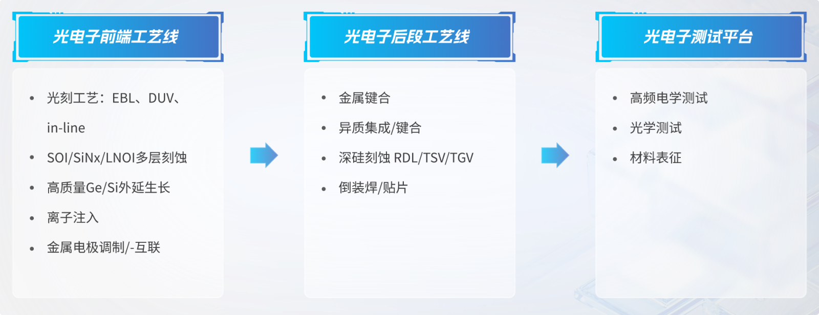图2 平台现有硅基光电子器件加工工艺及测试门类