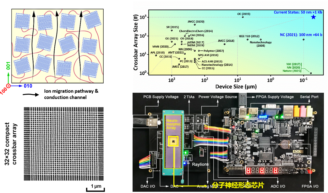 50 nm尺寸、1 Kb规模分子神经形态器件与芯片的样品照片与示意图