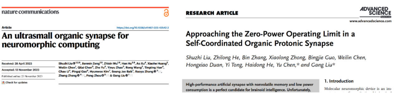 2. Shuzhi Liu, Jianmin Zeng, Zhixin Wu, Han Hu, Ao Xu, Xiaohe Huang, Weilin Chen, Qilai Chen, Zhe Yu, Yinyu Zhao, Rong Wang, Tingting Han, Chao Li, Pingqi Gao, Hyunwoo Kim, Seung Jae Baik, Ruoyu Zhang*, Zhang Zhang*, Peng Zhou* and Gang Liu*. An ultrasmall organic synapse for neuromorphic computing.