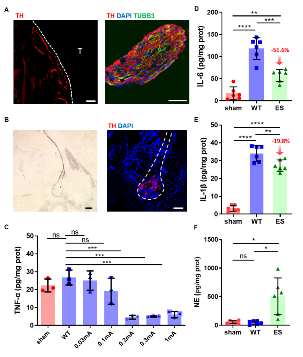 随后的染色也说明交感神经节和肌腱周围都存在大量交感神经,从组织学上验证神经通路的完整性。经过对交感神经不同电流强度下的电刺激,分析了受损肌腱组织周围的炎症情况,结果表明电刺激达到一定阈值后,可以使得炎症细胞因子TNF-α、IL-1β、IL-6显著下降,其中0.2mA的电流强度被进一步评估为治疗效果显著且安全的刺激值。与此同时,与交感神经相关的神经递质——去甲肾上腺素在刺激后显著上升,交感神经电信号亦异常活跃,说明更多的神经元被激活,团队通过基因测序初步探究刺激抑制验证的机理,与β2肾上腺素能受体(Adrb2)的调控有关。