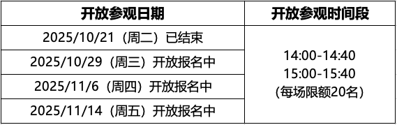 活动时间:2025年10月20号-2025年11月16号(每周开放两场,每场限额20名参观者,将由专业老师带队讲解,具体开放时间如下)