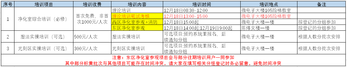 1) 理论培训:平台介绍、净化室规范、化学品安全、消防安全、湿法理论培训、测试设备介绍、预约系统操作培训。