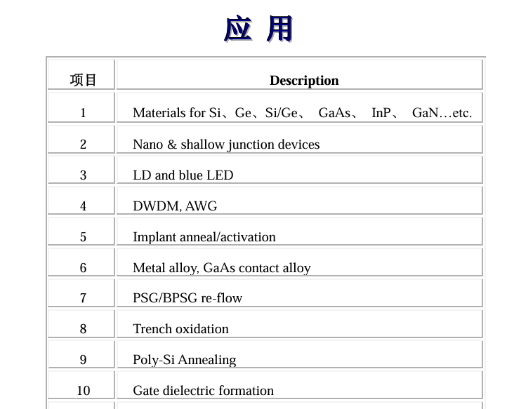 此设备用于样品的快速热退火工艺,可以实现300~1100度之间的热退火, 可以用于离子注入后的激活工艺,也可以用于各种材料的热退火,损伤修复等工艺。 通过惰性气体防护,有效防止样品被氧化等