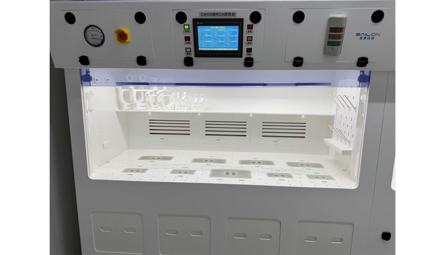 该设备配置2套不同尺寸的槽体,可以用于8~6寸以及4~3寸两种类型的晶圆的无机RCA清洗, 槽体最多可以进行5片硅片的工艺处理, 可以通过SC1,SC2, SPM 以及DHF等溶液试剂进行RCA清洗的各个工艺步骤,去除样品上的各种污染以及颗粒等